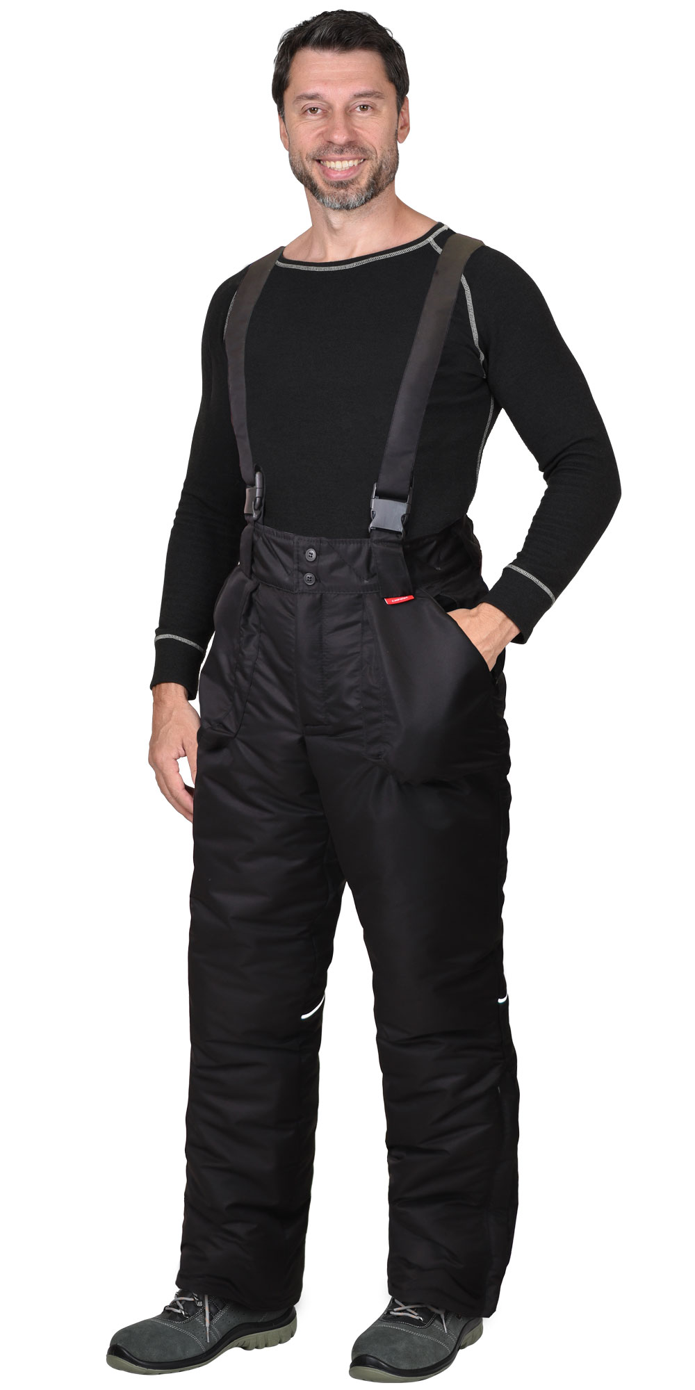 Брюки прямые на утеплённой подкладке, с застежкой спереди на молнию – гульфик. Брюки с широким поясом с застежкой на 2 пуговицы, с боковыми накладными карманами с молнией, со съёмными бретелями. Бретели пристегиваются к брюкам при помощи пуговиц и петель, регулируются по длине защелками-фастексами. По боковым швам внизу разрез с молнией. В брюках на задних половинках предусмотрен кант СВМ 3мм 100К для обозначения сигнальной видимости.