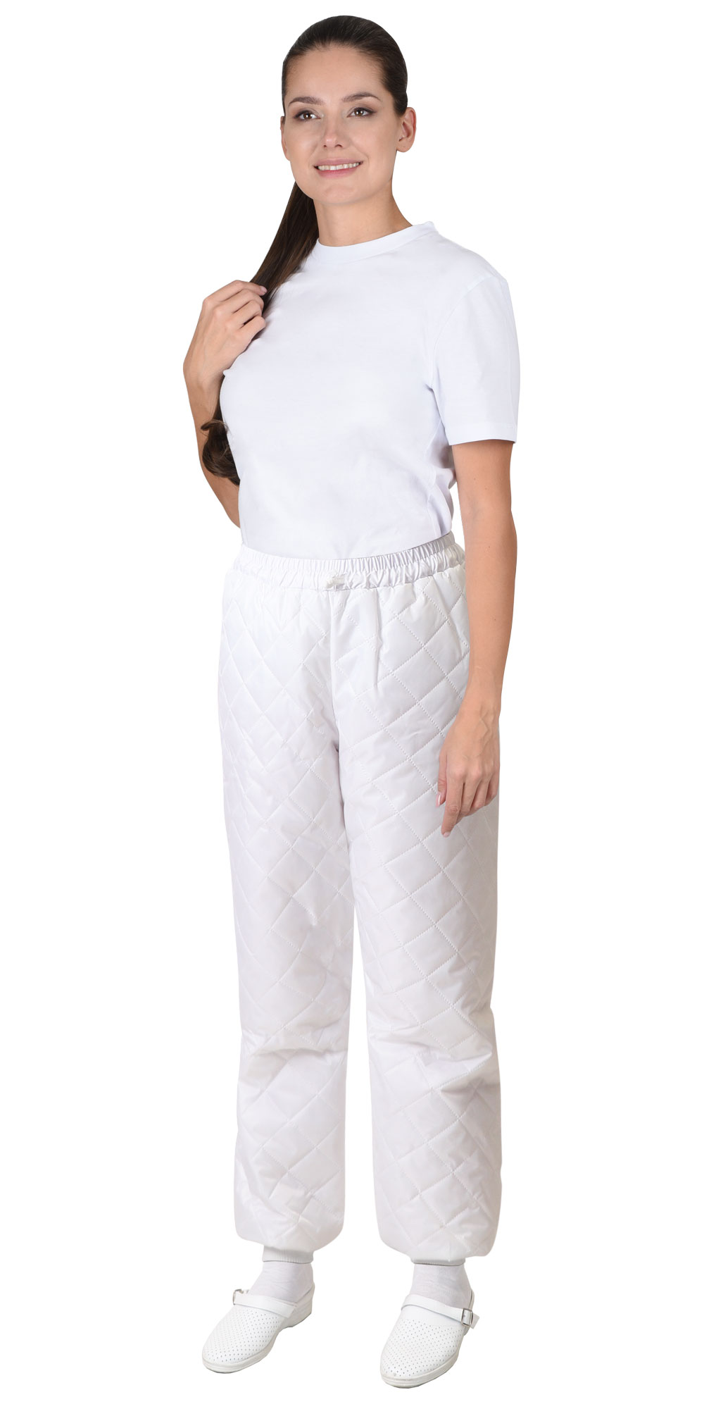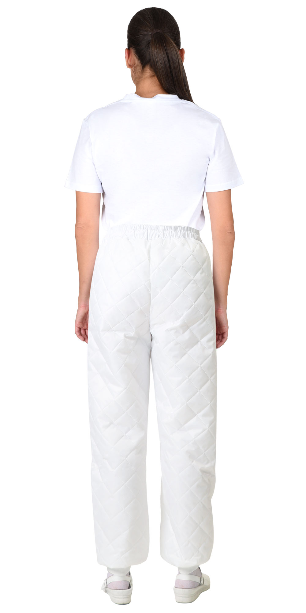 Брюки утеплённые прямого силуэта с притачным поясом, стянутым по объёму на эластичную тесьму. Выполнены из спаянного с утеплителем в виде ромбиков полотна, на притачной подкладке. Без боковых швов, без карманов, без застёжки, по низу брюки с притачными трикотажными манжетами.