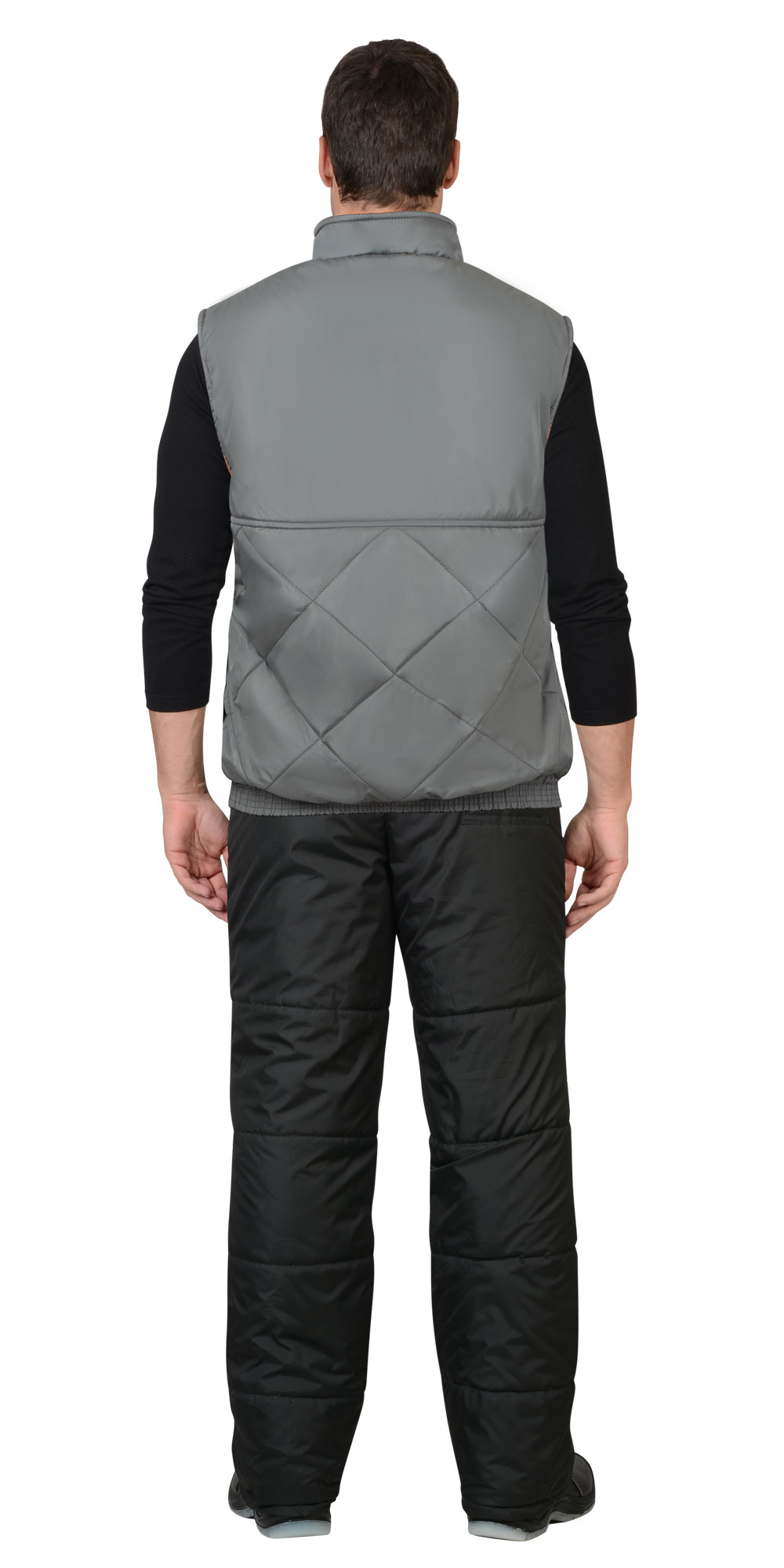 Жилет утеплённый, стёганый, с застёжкой на молнию, с воротником стойка, подкладка жилета и внутренний воротник из флиса контрастного цвета. Полочки и спинка с отрезными кокетками без стёжки для возможности нанесения логотипа. Жилет с одним нагрудным карманом с молнией, двумя большими накладными нижними карманами с наклонным входом и внутренним накладным карманом на подкладке с правой стороны. По низу жилет с поясом, собранным на резинку.