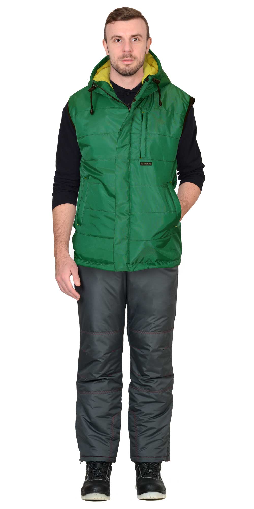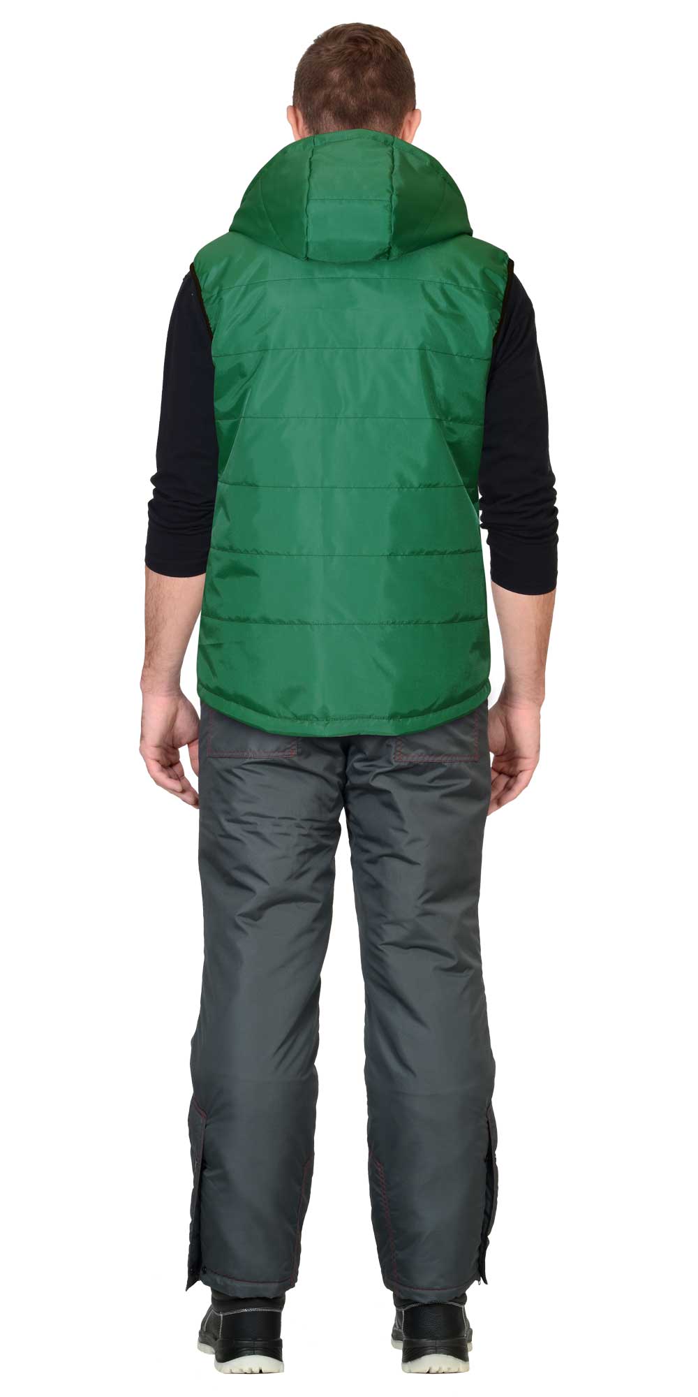 Жилет утеплённый, выстеган с утеплителем горизонтальными строчками, с флисовой подкладкой контрастного цвета, с втачным капюшоном, с застёжкой на молнию, прикрытую ветрозащитным клапаном от края капюшона до низа изделия, застёгивающимся на кнопки. Жилет с одним нагрудным карманом с молнией и двумя нижними карманами. Спинка жилета, удлинённая с фигурной линией низа. Пройма окантована резинкой. Объём капюшона по лицевому вырезу регулируется шнуром с фиксаторами.