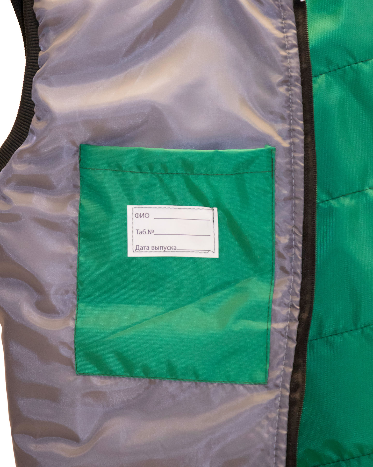 Жилет утепленный прямого силуэта на подкладке, с трикотажным воротником стойкой, центральной бортовой застежкой на тесьму «молния» и внутренним накладным карманом.