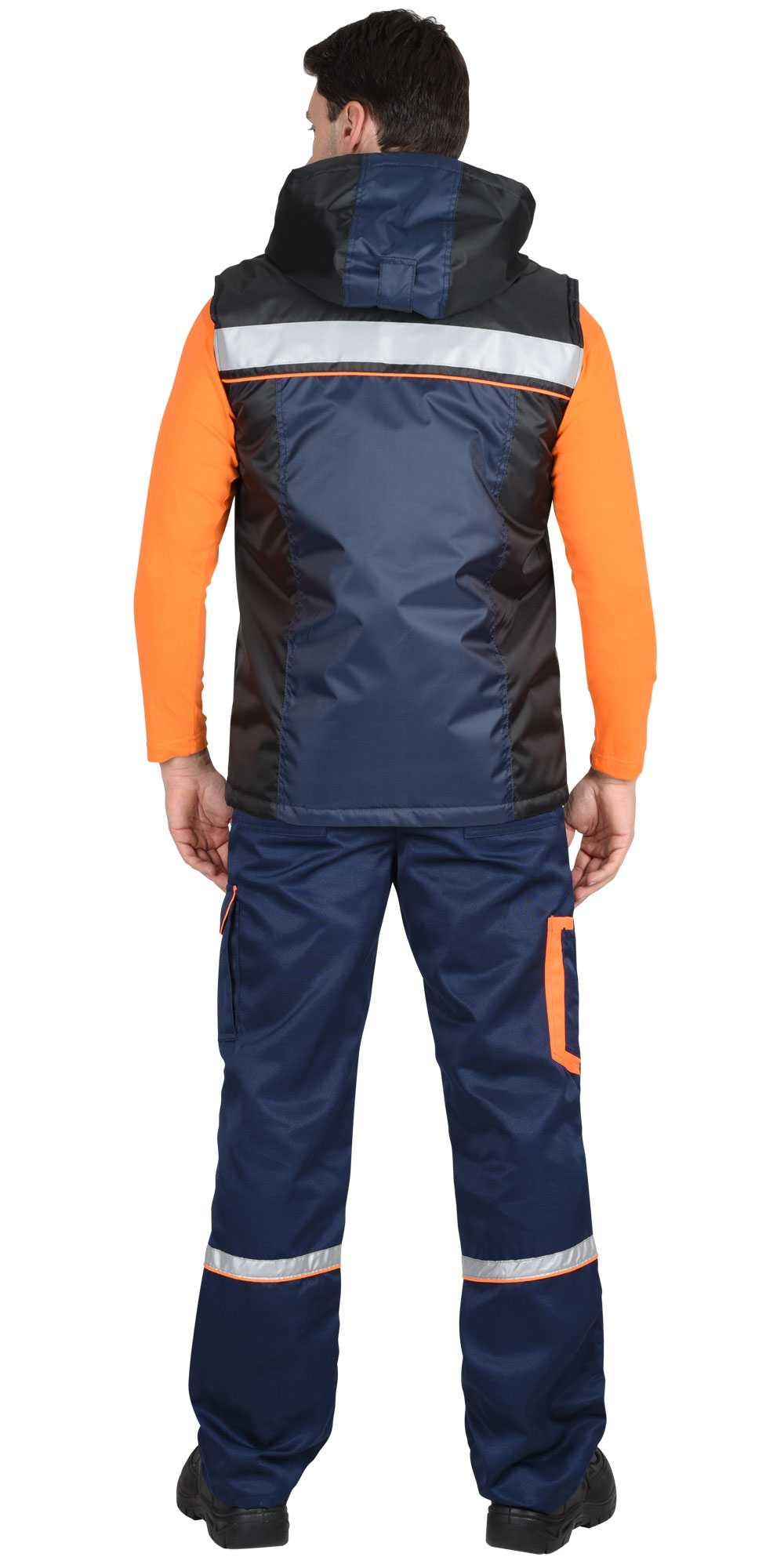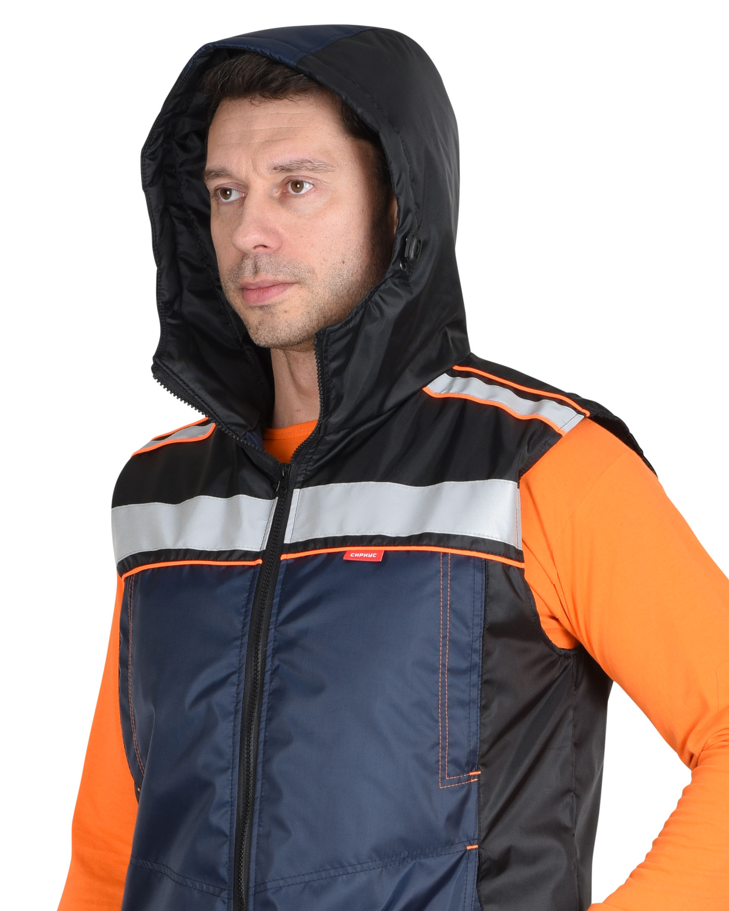 Жилет утепленный, с центральной бортовой застёжкой на молнию, с подрезными бочками, с верхними карманами на молнии в рельефе, с нижними карманами в рельефе, с втачным капюшоном.