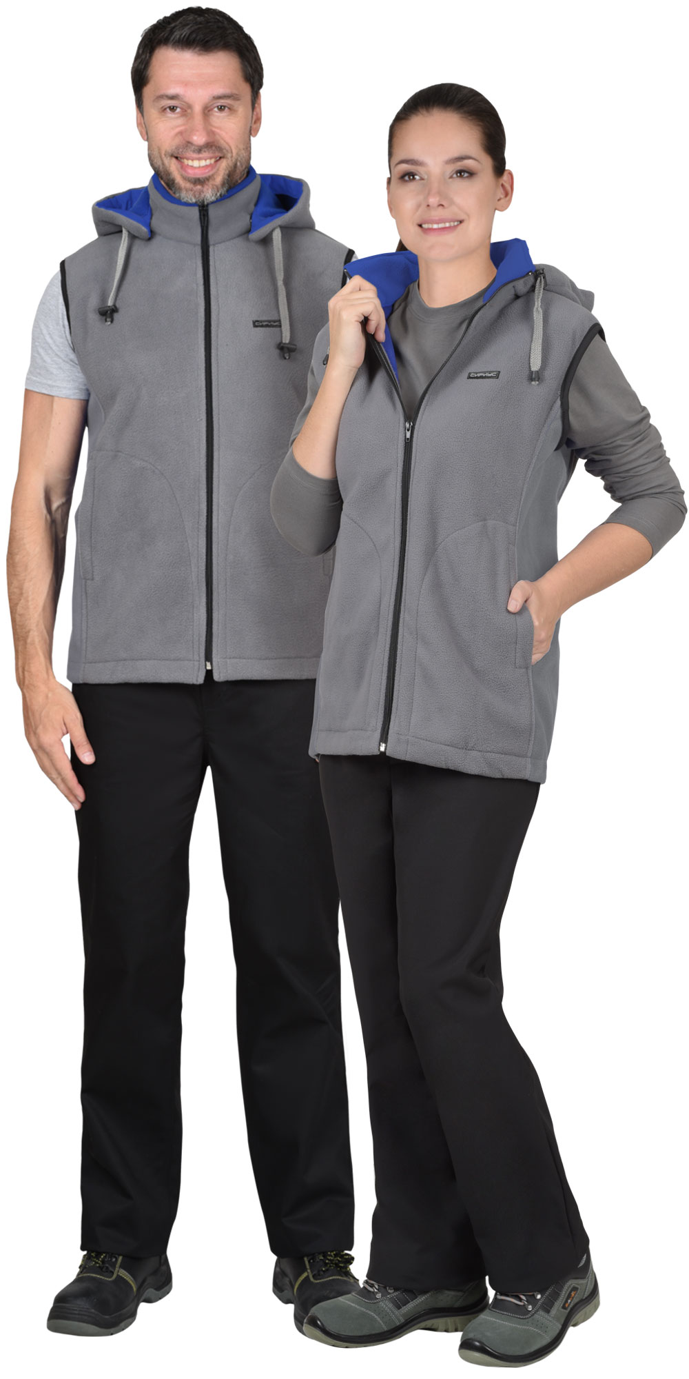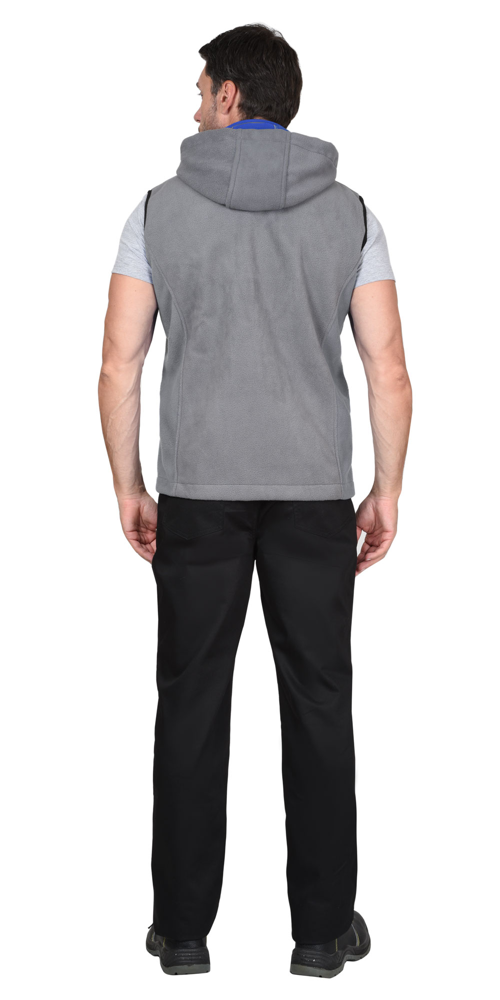 Жилет из дублированного флиса, без подкладки, прямого силуэта, с втачным воротником стойка, со съёмным капюшоном, со сквозной центральной, бортовой застёжкой на молнию, с отрезными бочками, с нижними боковыми карманами в рельефе. Пройма окантована резинкой ш.25 мм. ТР ТС 017/2011