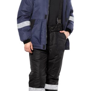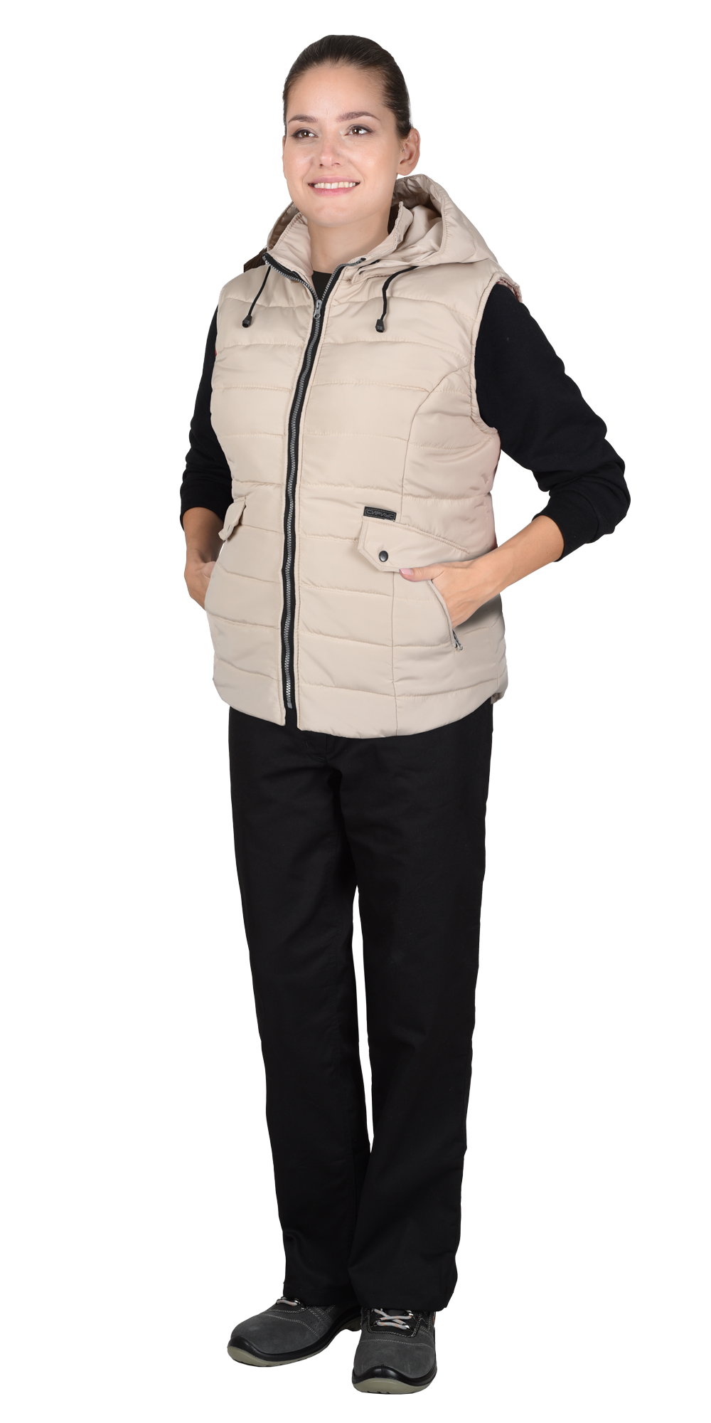 Жилет утеплённый, выстеган с утеплителем горизонтальными строчками, с центральной застёжкой на молнию. С воротником стойка и съемным утепленным капюшоном. Жилет с двумя нижними прорезными карманами, частично прикрытыми клапанами с кнопками. Нижняя часть проймы стянута эластичной тесьмой, для лучшего прилегания. Жилет с фигурной линией низа спереди и сзади.