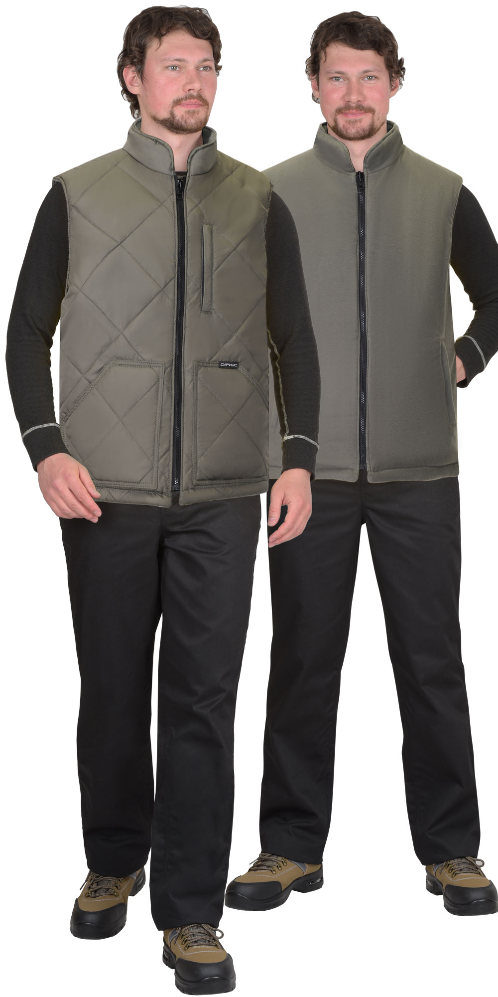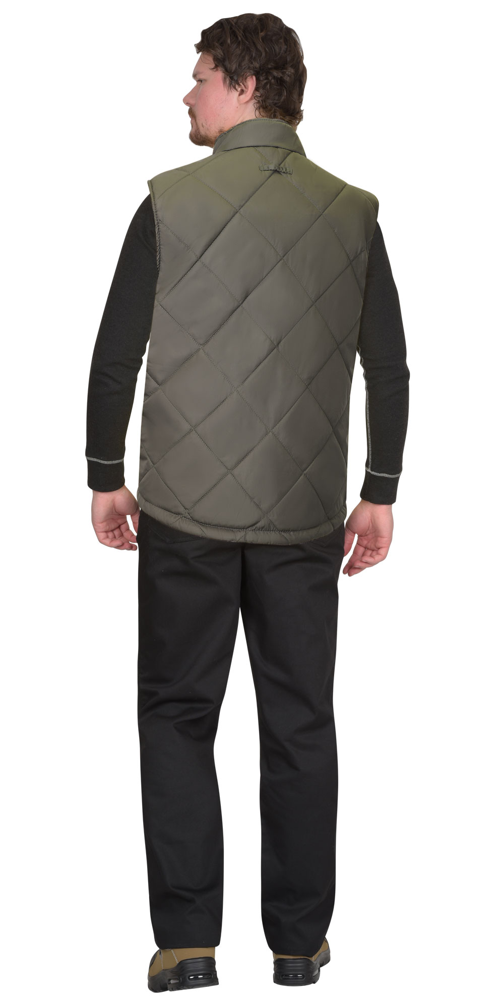 Жилет утеплённый, двухсторонний, одна сторона жилета стёганая в виде ромбов из курточной ткани с водоотталкивающей пропиткой, другая – из флиса. Жилет прямого силуэта, с застёжкой на молнию с перекидным замком, с воротником стойка, спинка жилета, удлинённая по отношению к переду, с фигурной линией низа. Стёганная сторона жилета с одним нагрудным карманом с молнией и двумя большими накладными карманами с наклонным входом. Сторона жилета из флиса с прорезными боковыми карманами с молнией.