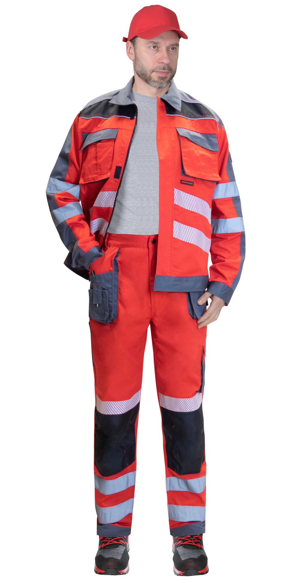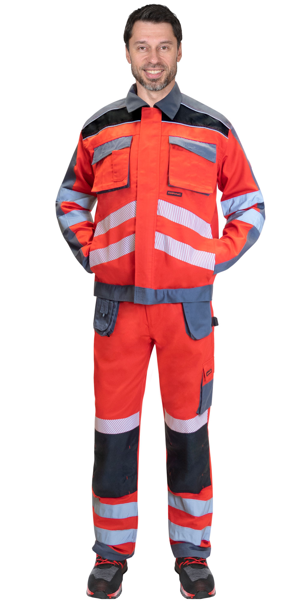 Светоотражающий материал: термотрансферная лента с рефлектором 50 мм, светоотражающий кант и светоотражающая лента 50 мм.