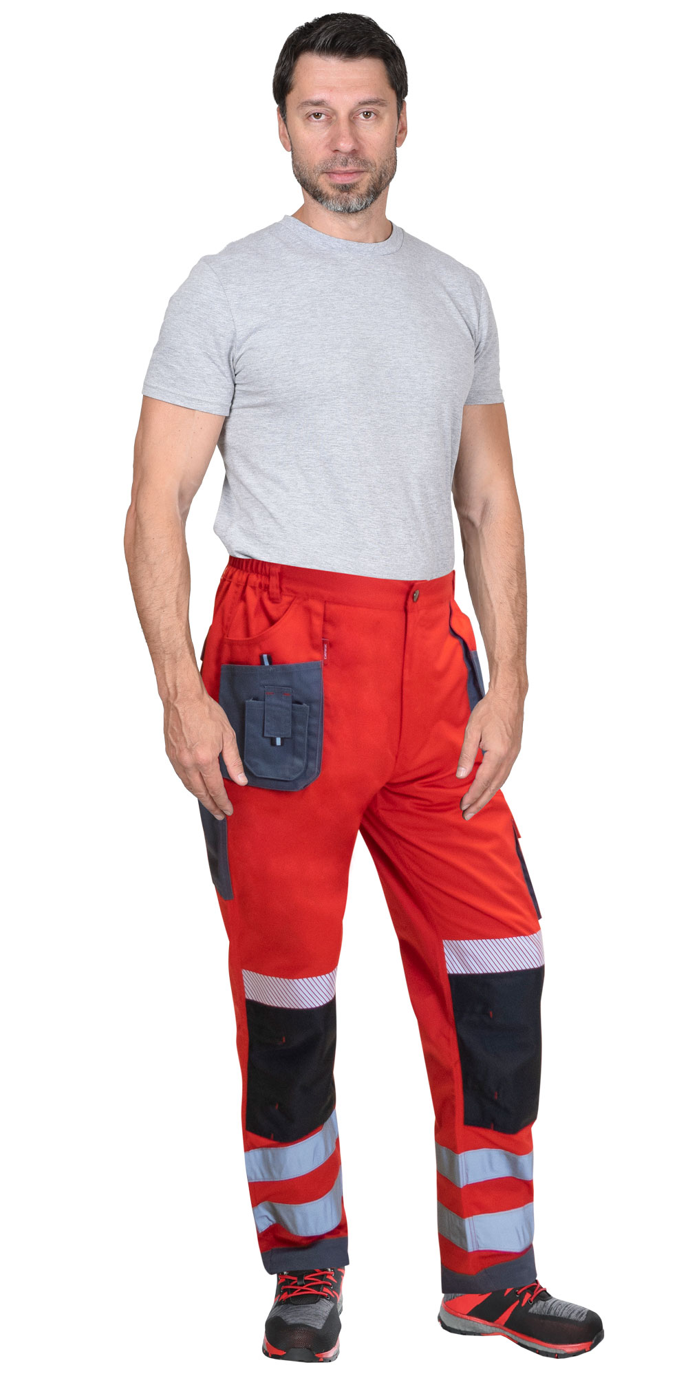 Брюки прямого кроя на поясе, с застёжкой гульфика на молнию, с накладными карманами спереди, сзади и на боковых швах. Брюки с усилительными накладками в области колен с нижним входом для амортизационного вкладыша.