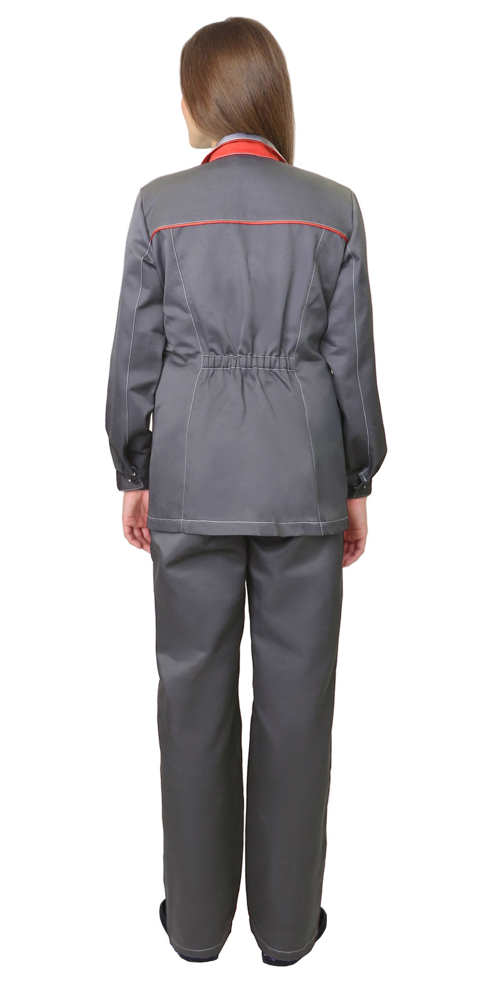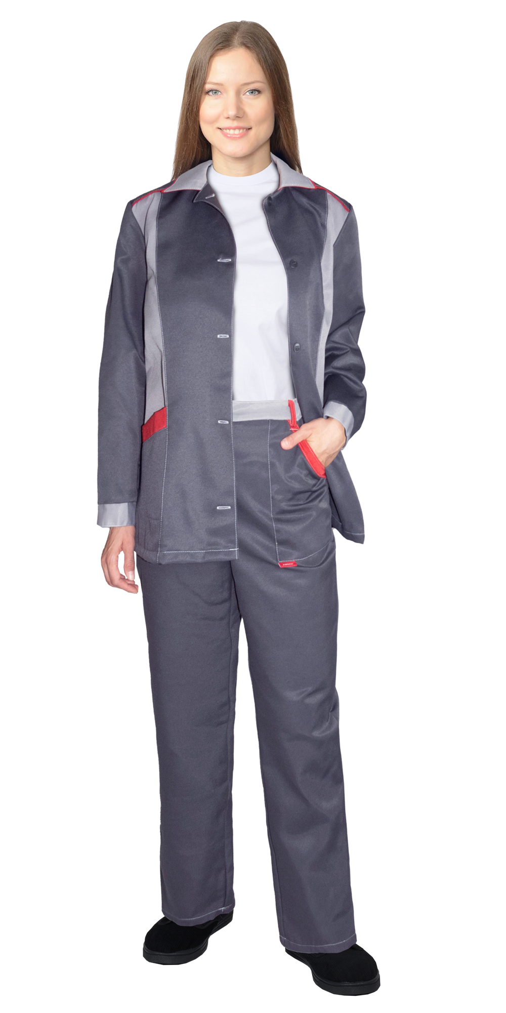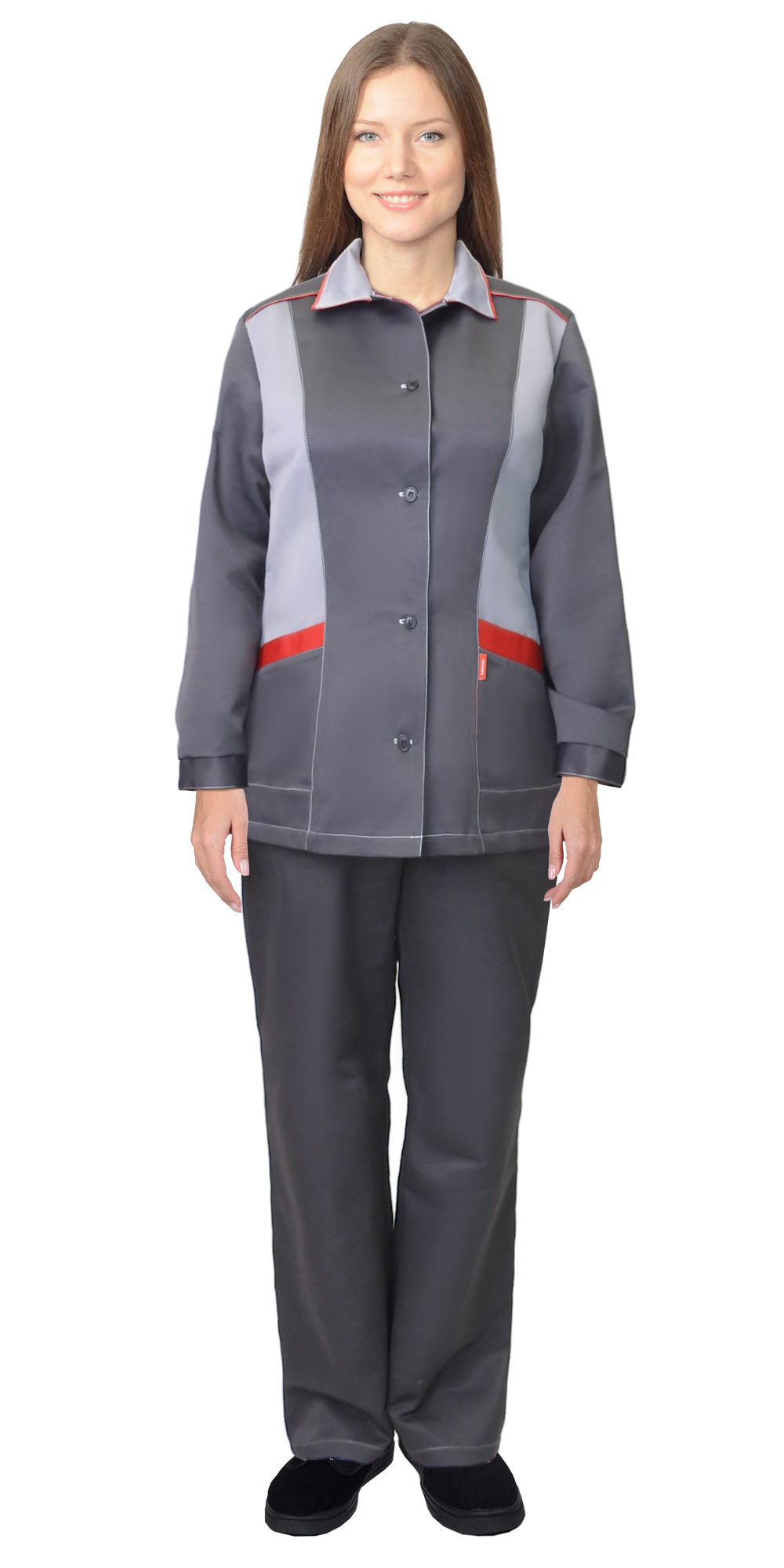 Костюм СИРИУС-ЗОЛУШКА женский, куртка, брюки, темно-серый со светло-серым и красной отделкой