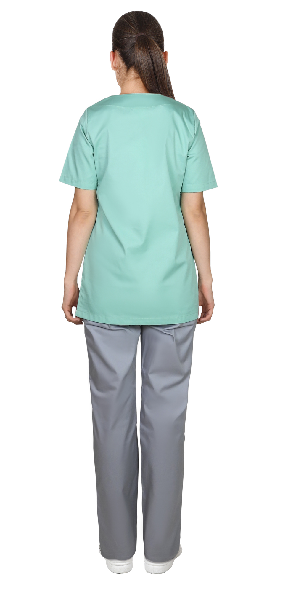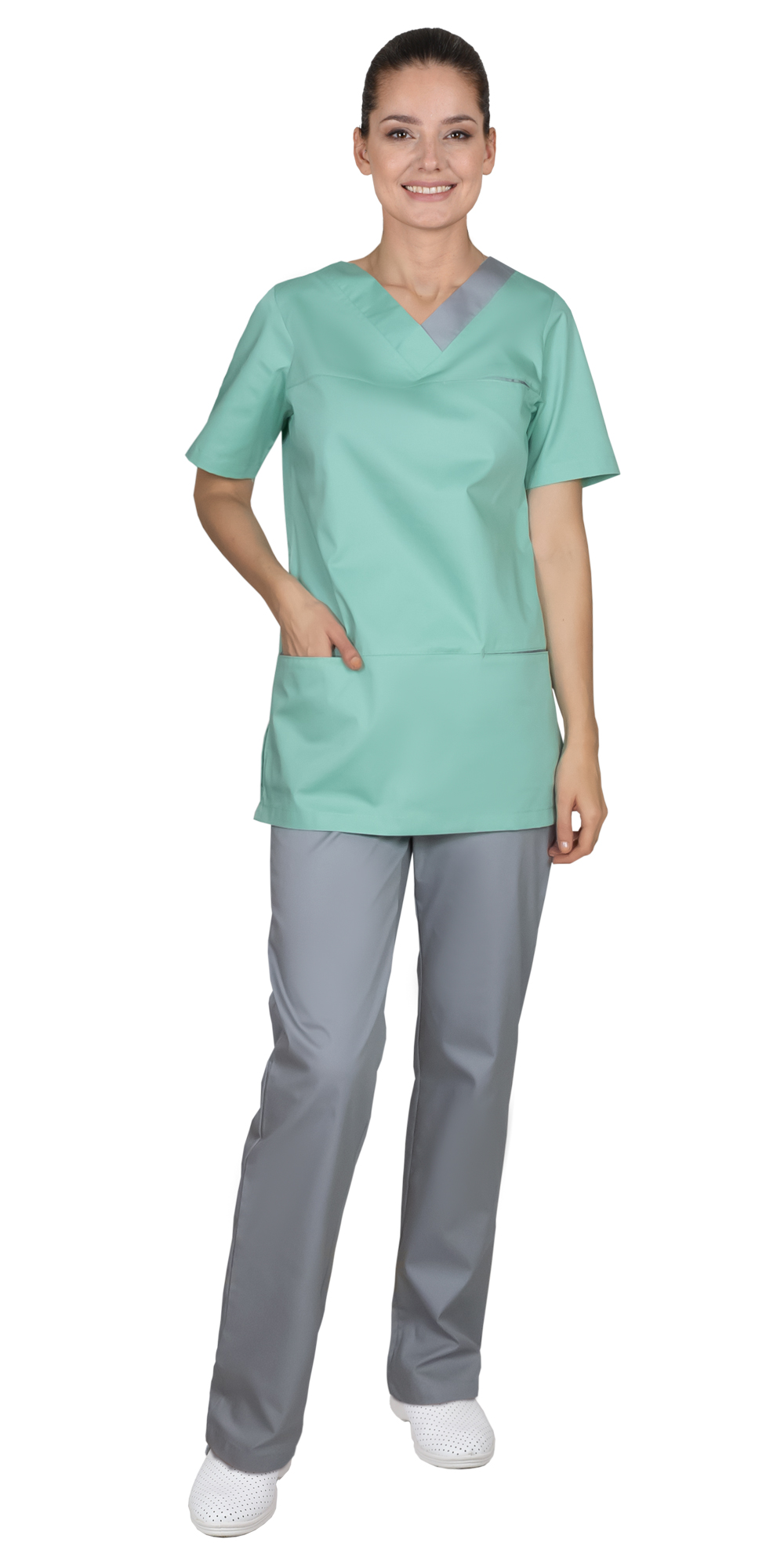 Костюм комбинированный из ткани двух цветов состоит из блузы мятного цвета и брюк серого цвета.