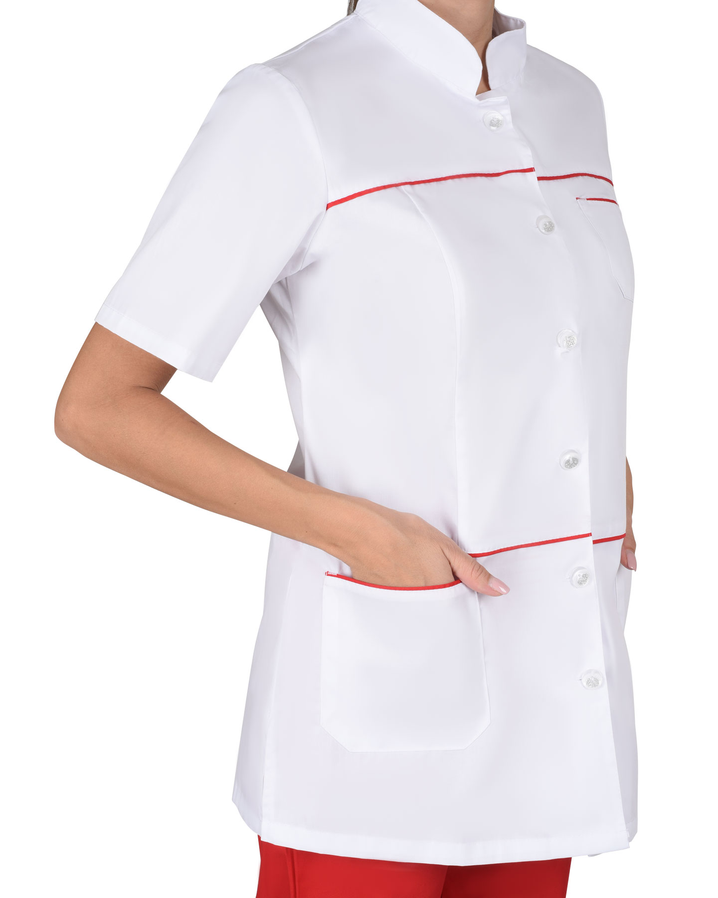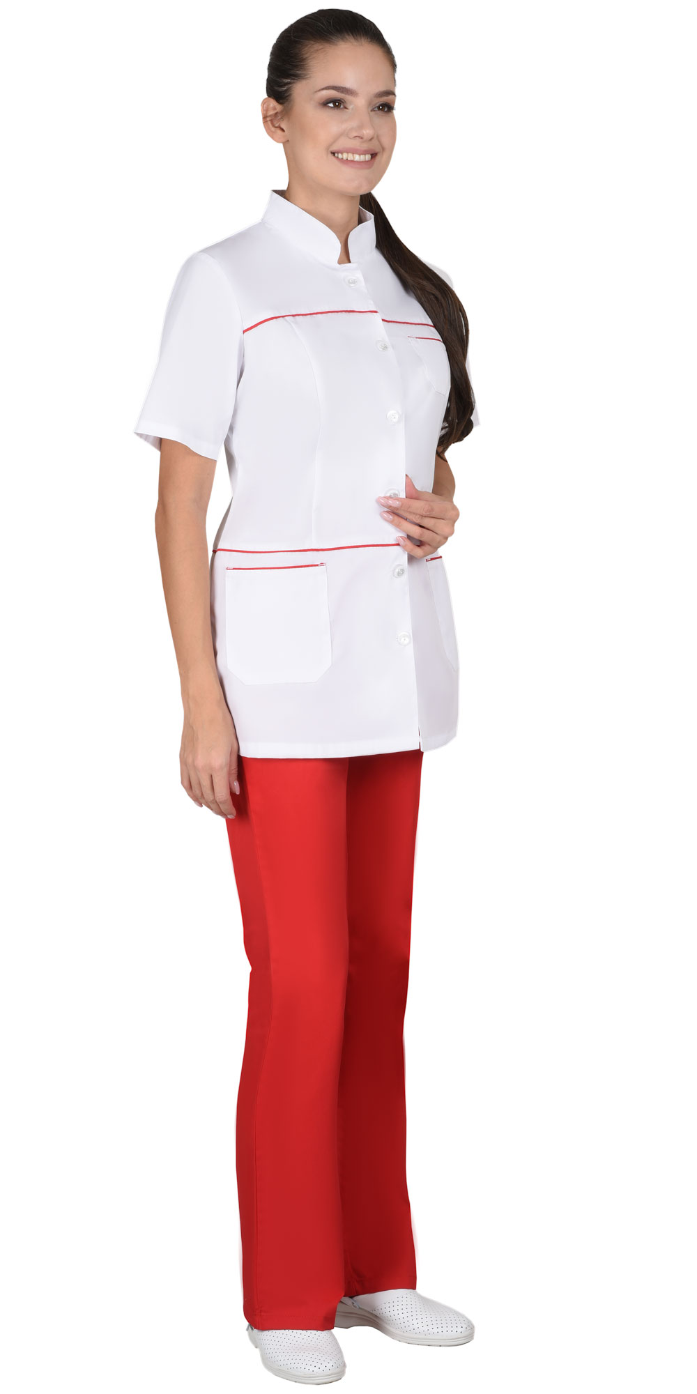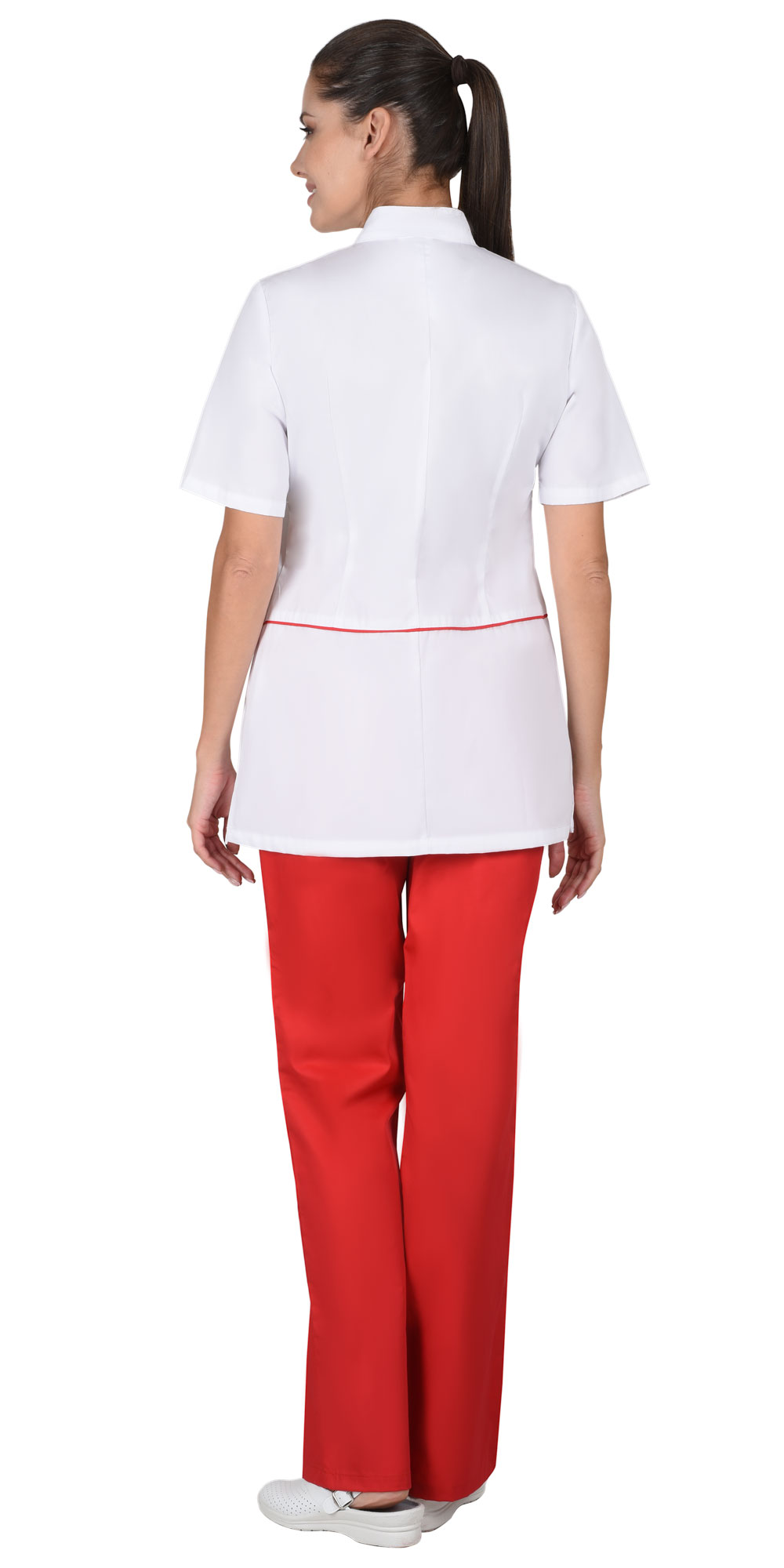 Костюм состоит из блузы и брюк. Блуза полуприлегающего силуэта, с центральной застёжкой на 6 петель и пуговиц, с воротником «стойка», Полочка с одним верхним и двумя нижними накладными карманами. Рукава втачные, короткие. Блуза отделана втачным кантом из контрастной ткани в цвет брюк. Брюки прямого силуэта, с заниженной талией, с застежкой гульфика на тесьму «молния», притачным поясом, застегивающимся на пуговицу, частично стянутым резинкой по боковым сторонам.