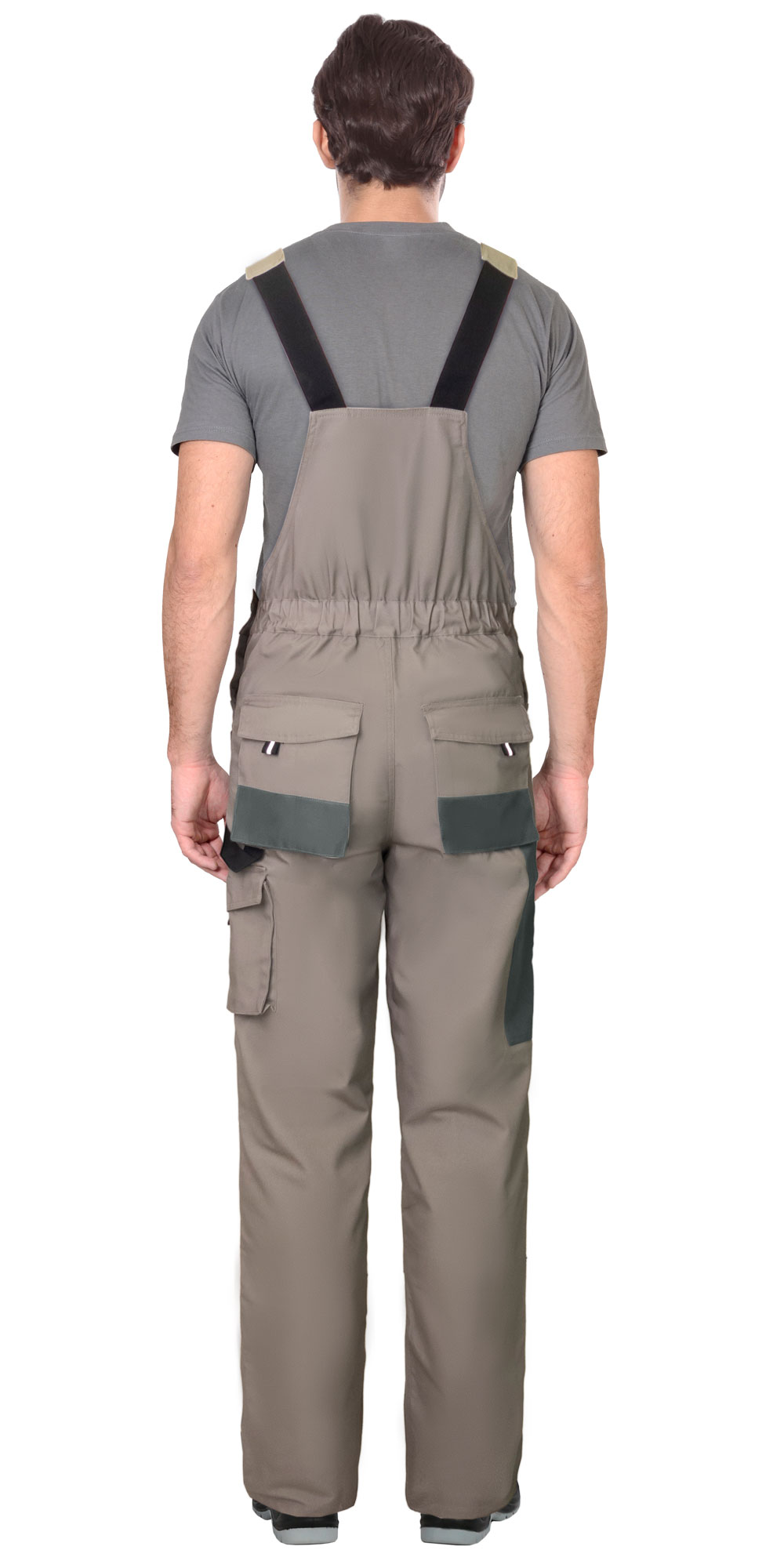 Полукомбинезон прямой с застёжкой в боковых швах на пуговицы и в среднем шве передних половинок на гульфик с молнией, с наколенниками, с бретелями. Полукомбинезон с накладными карманами спереди и сзади и на левом боковом шве, с объёмными наколенниками из плотной, непромокаемой ткани с нижним входом для амортизационного вкладыша. Бретели регулируются при помощи застежек-фастексов и резинки.