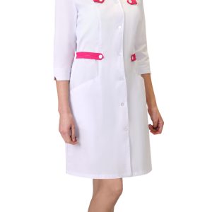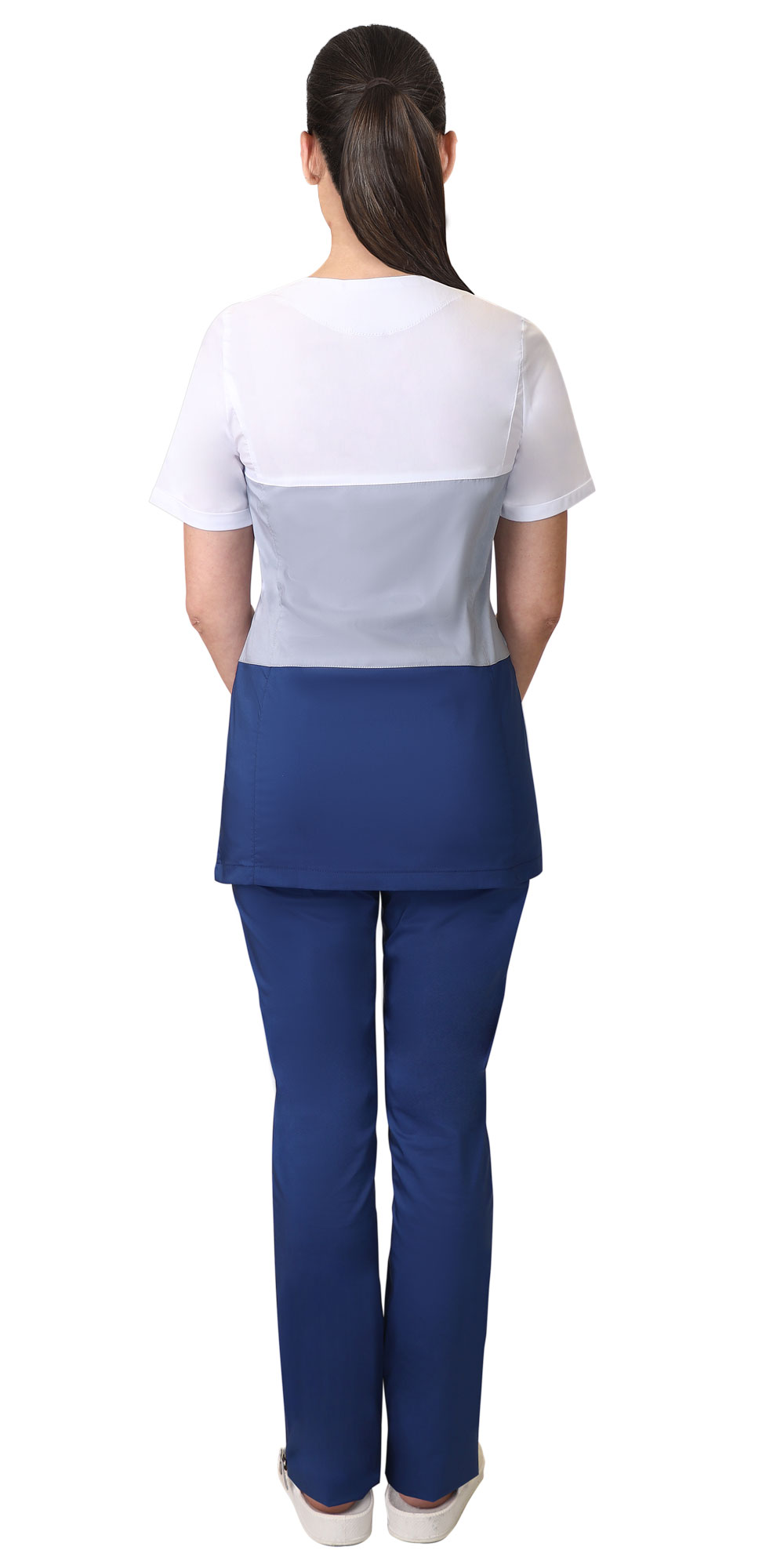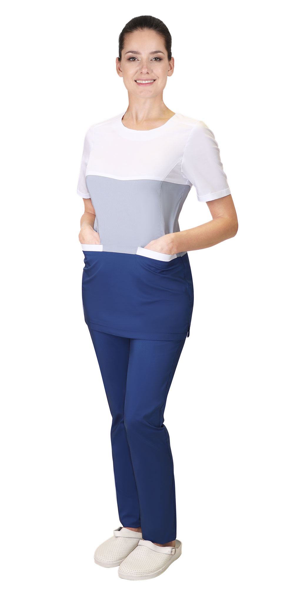 Блуза полуприлегающего силуэта, без застёжки, с овальным вырезом. Нижние горизонтальные карманы в швах с листочкой. Рукава втачные, короткие. По боковым швам разрезы. Брюки прямого силуэта, с застежкой гульфика на тесьму «молния», притачным поясом, застегивающимся на пуговицу, частично стянутым резинкой по боковым сторонам. Два боковых и два накладных задних кармана.