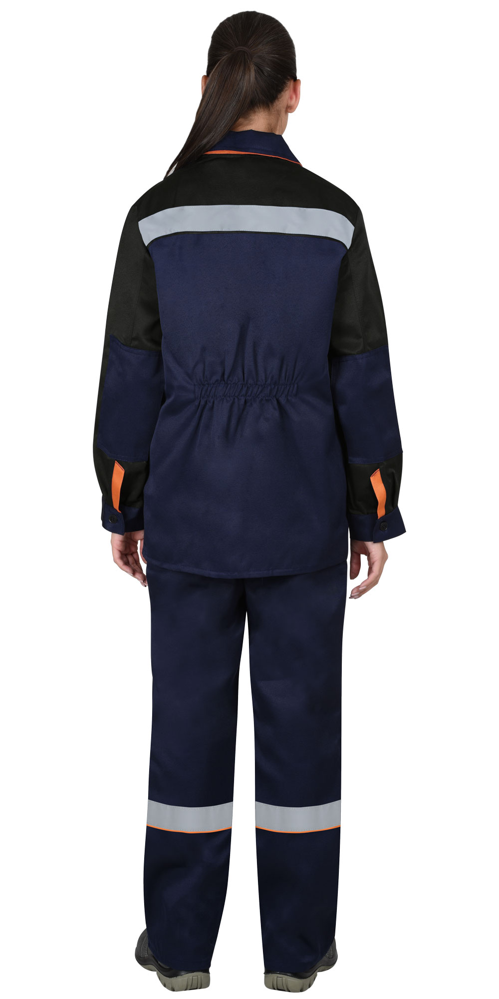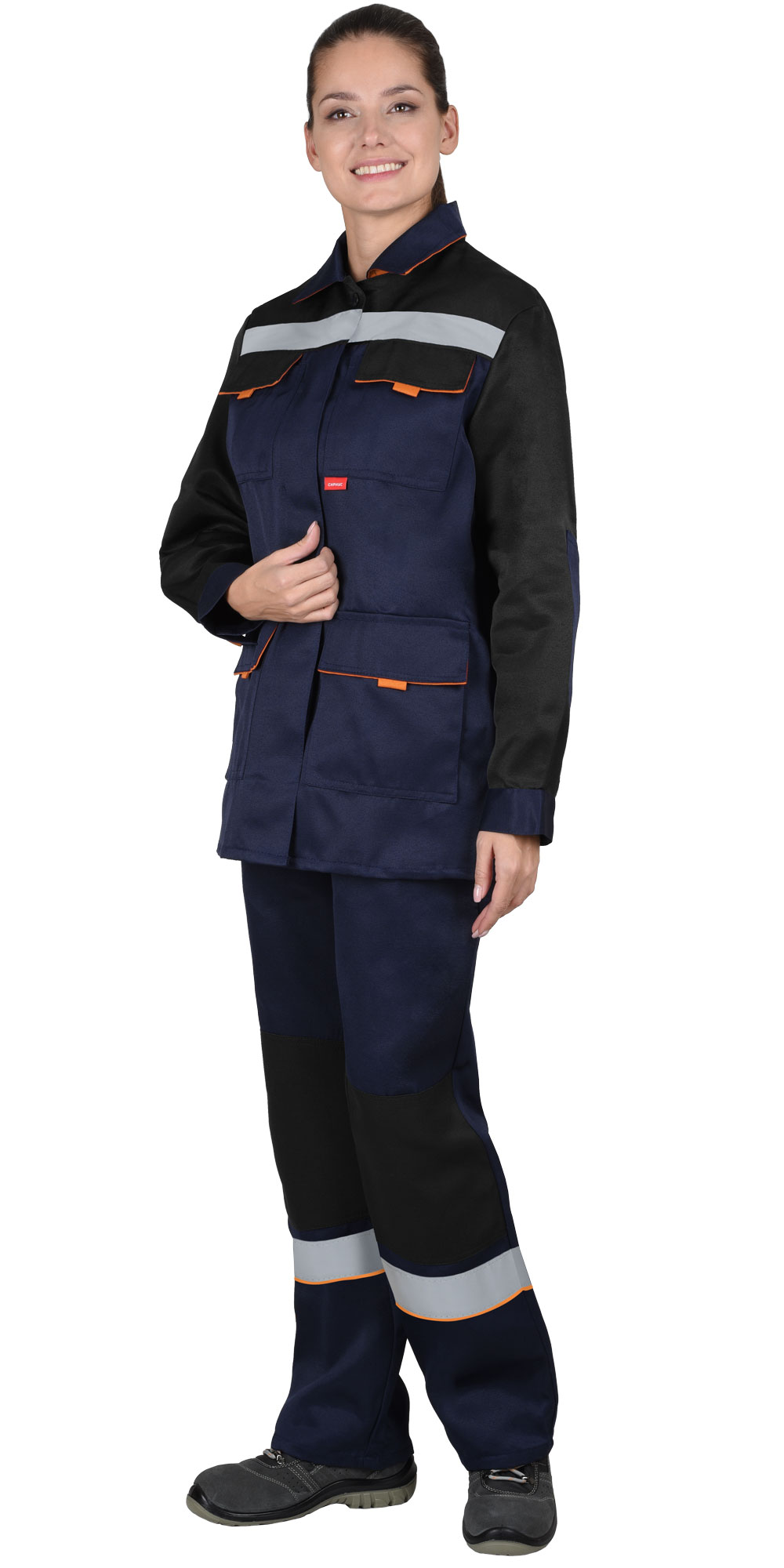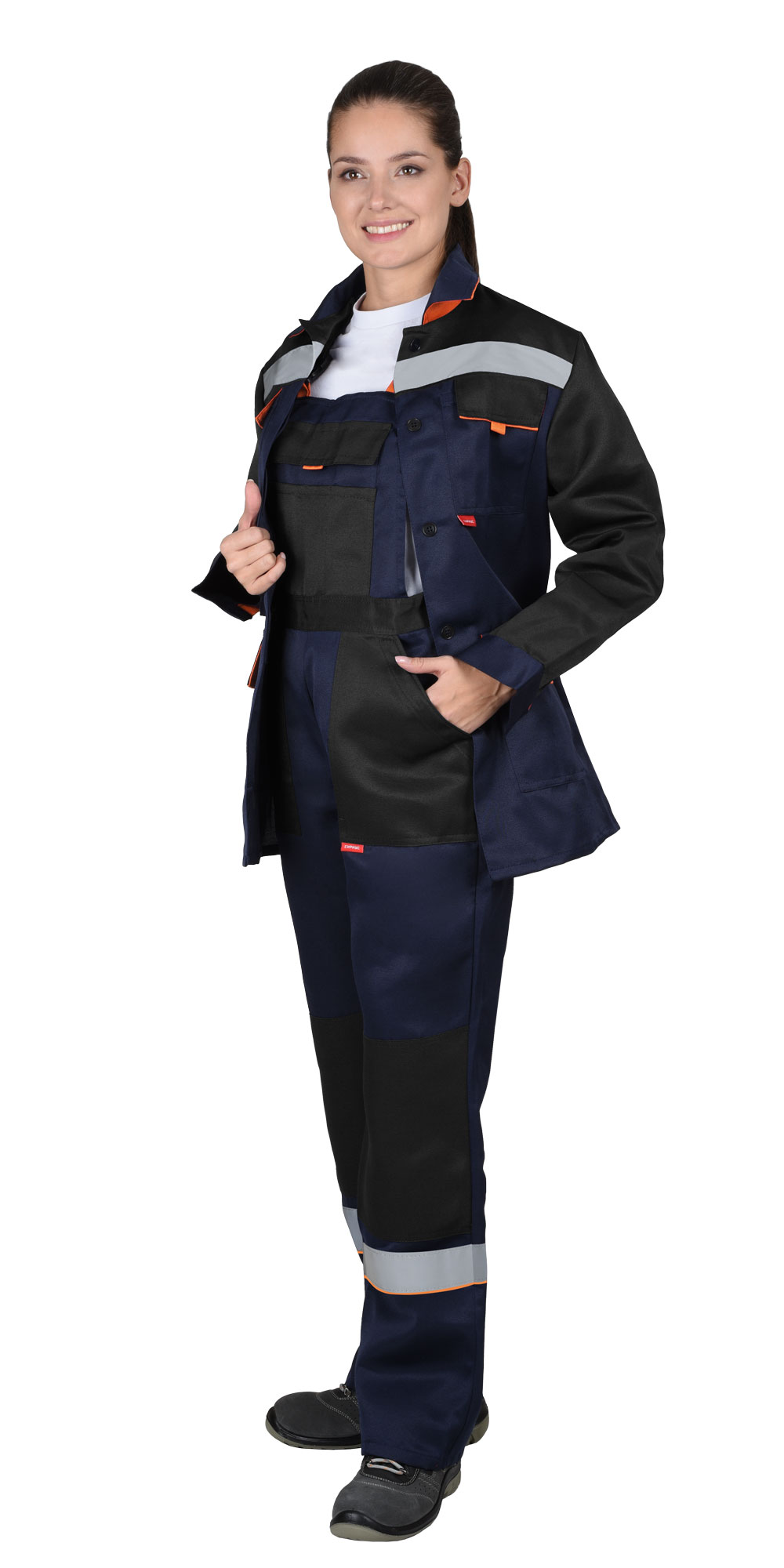 Костюм летний женский, состоит из куртки и полукомбинезона, в костюме предусмотрена лента светоотражающая ш.50 мм для сигнальной видимости.