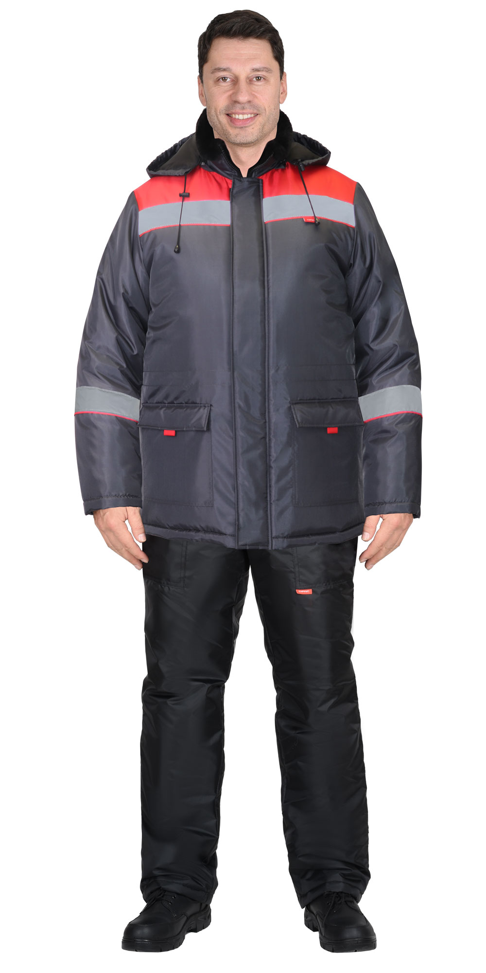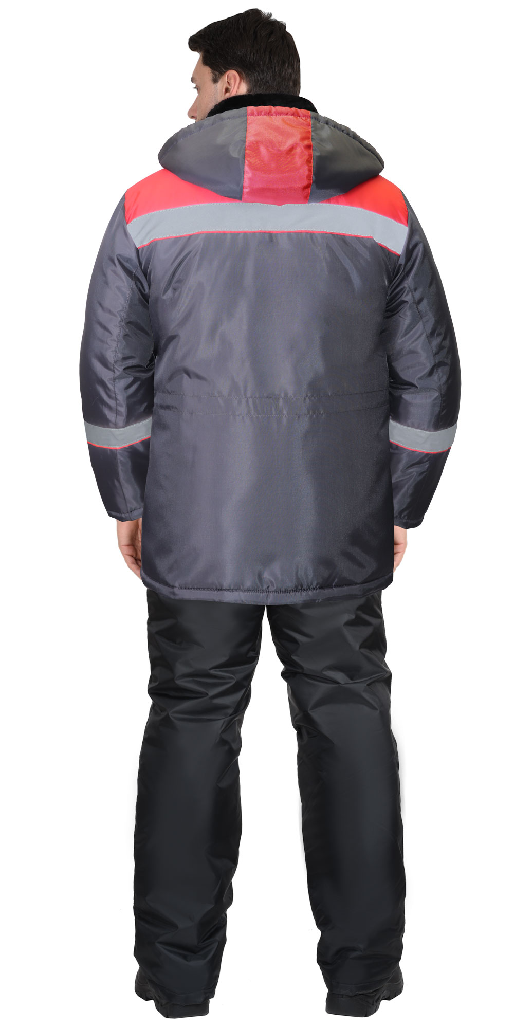 Куртка удлинённая, на утеплённой подкладке, с воротником стойка, внутренний воротник меховой, с центральной застёжкой на молнию до края воротника, которая закрыта ветрозащитной планкой, со съёмным капюшоном. Куртка с нижними накладными карманами с клапаном и с карманом на левой стороне подкладки. По талии куртки кулиска для регулирования объема. В куртке предусмотрена светоотражающая полоса 50мм для обозначения сигнальной видимости.