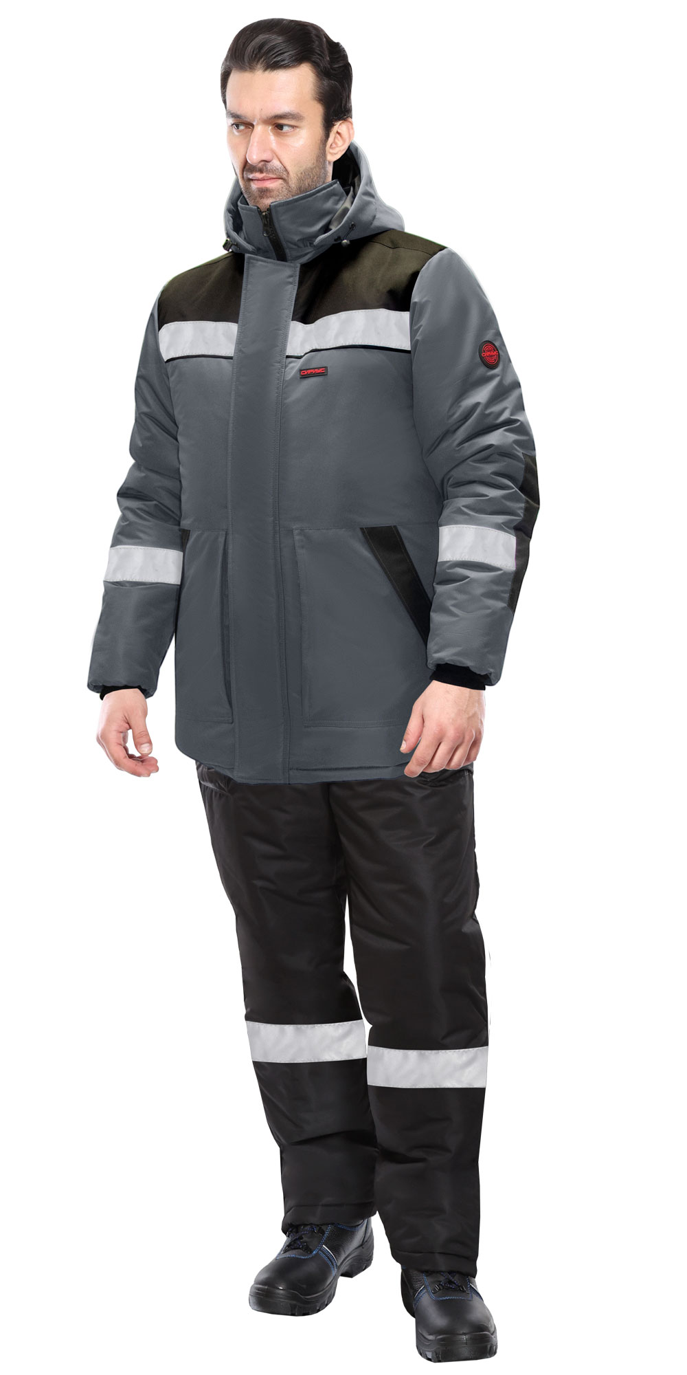 Куртка прямого силуэта, удлинённая, с воротником стойка, с центральной застёжкой на молнию от края воротника, накрытую ветрозащитным клапаном с потайными липучками. Куртка с нижними накладными полуобъемными карманами. Плечевые швы куртки смещены в сторону полочек. Рукава втачные с трикотажными манжетами. Внутренний воротник из флиса. Куртка со съемным капюшоном, который пристегивается к горловине куртки при помощи молнии. Подкладка куртки утепленная, с левой стороны подкладки накладной карман на молнии.