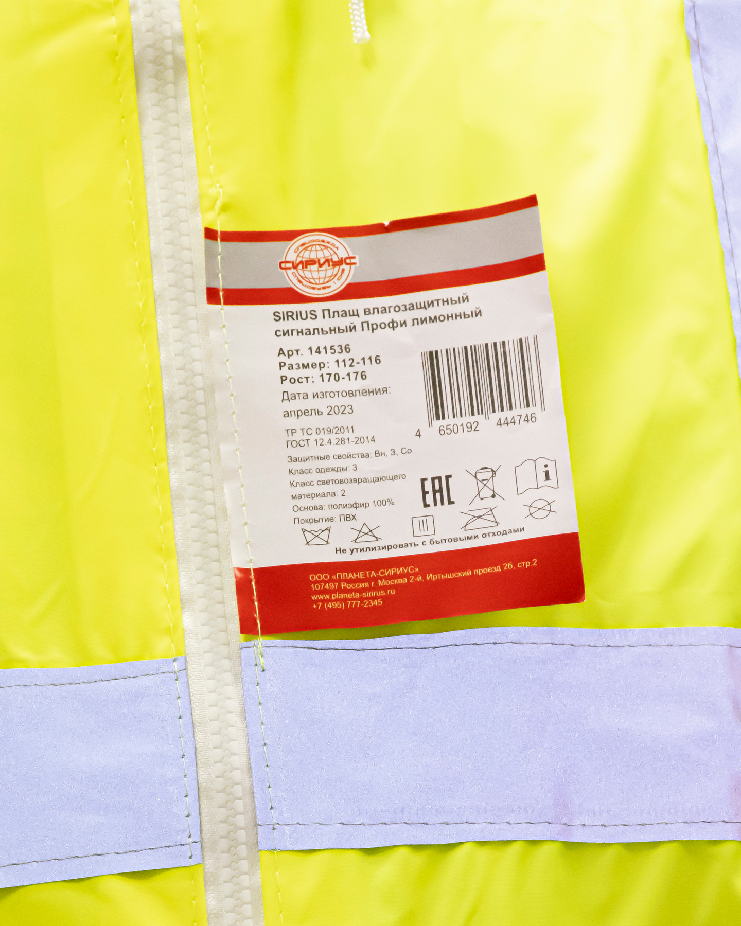 Плащ изготавливается из прочной плащевой ткани ярко-лимонного цвета с ПВХ покрытием. Вес ткани — 225 гр./метр.кв.