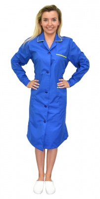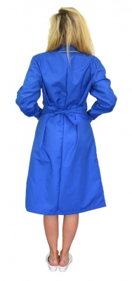Халат женский васильковый с центральной бортовой застежкой на 5 петель и пуговиц, отложным воротником выполненным из отделочной ткани с лацканом, рельефами на полочках и спинке, двумя боковыми накладными карманами с косым входом и одним верхним накладным карманом верхняя часть которых выполнена из отделочной ткани, рукава втачные с манжетами, застегивающимися на пуговицы. Спинка с хлястиком по линии талии.
