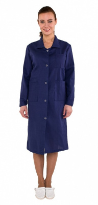 Халат рабочий свободного покроя, с застежкой на пуговицах. Рукава втачные длинные. Воротник в халате — отложной. Халат рабочий темно-синий — длинный, удобный в работе.